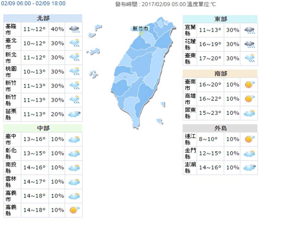 昨(8日)晚間北東地區開始飄雨,中部地區也有零星雨,氣象局預估,今天中午過後,天氣將逐漸轉為乾冷型態,只有東半部會出現零星降雨,氣象局表示,北台灣今一整天都屬於偏冷的天氣型態,最高溫也只有13、14度,中部則15至18度,不過,要特別提醒南部民眾,雖然白天高溫還可以到達23度,但是中午過後,冷空氣將會一路南下,全台都會「急凍」,北部及東北部入夜,一直到明天清晨,都可能出現8、9度溫度,中部也只有10度,其他地區則12~14度。