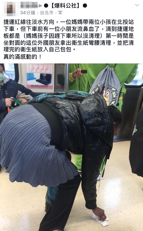 一名網友在臉書社團《爆料公社》上發文,表文表示台北捷運紅線往淡水方向,有一位媽媽帶著兩位小孩準備在北投站下車。不料下車前其中一位小朋友流鼻血,滴得滿地都是,當時媽媽趕時間就直接帶著孩子下車,並沒有清理。正當所有車上乘客怕尷尬,在一旁靜觀其變之際,一名外國人卻挺身而出,伸出援手!