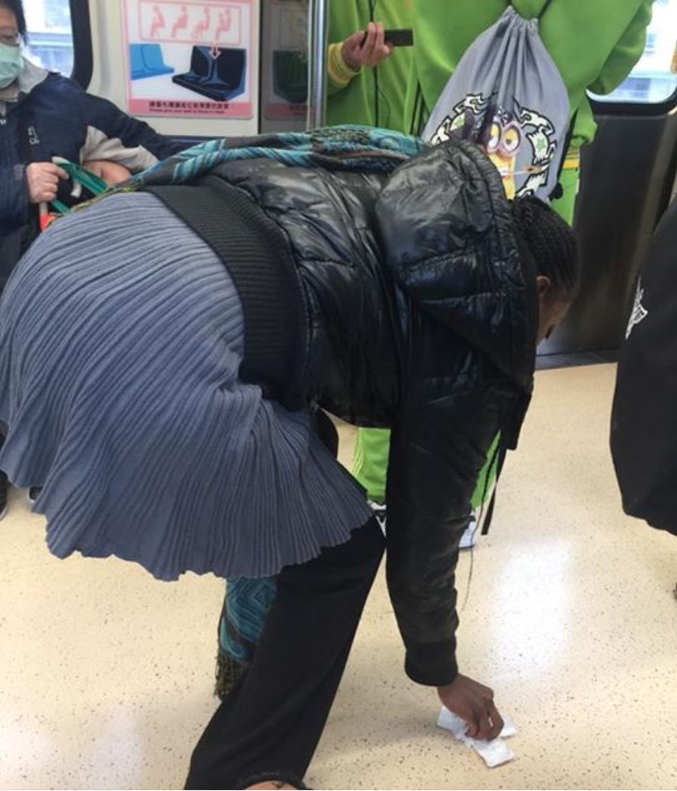 意外發生的第一時間,坐她對面的外國人立刻拿出衛生紙彎腰擦拭地板。最令人感動的是,這名外國人清理完後,還把衛生紙放進自己的包包,讓這名發文網友大讚:「真的滿感動的!」在照片中,只見一旁的乘客對於地上的鼻血不在意,甚至還滑起手機,或是閉目養神,只有這位外國人親自彎腰清理鼻血。