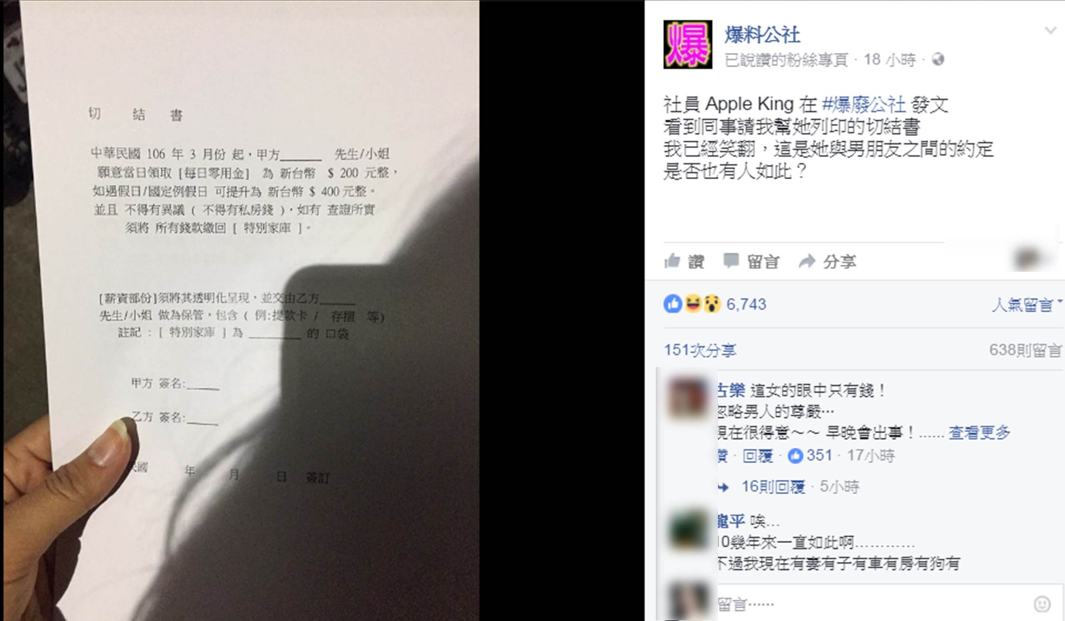 該名網友在《爆廢公社》貼出一張切結書,內容寫道「看到同事請我幫她列印的切結書,我已經笑翻,這是她與男朋友之間的約定,是否也有人如此?」原來是,網友的同事請他幫忙列印,網友不經意看了列印的內容,才發現原來是同事要給男朋簽的切結書,內容提到「自106年3月份起,男方願意當日領取每日零用金200元整,如果遇假日/國定可提升到400元,不得藏私房錢,如果被發現,就要把所有錢變成特別家庫;新資部分,須將其透明化呈現,並交由女方保管,包括提款卡和存摺等」,此篇貼文後來被網友轉貼到了《爆料公社》,沒想到卻意外引起討論。