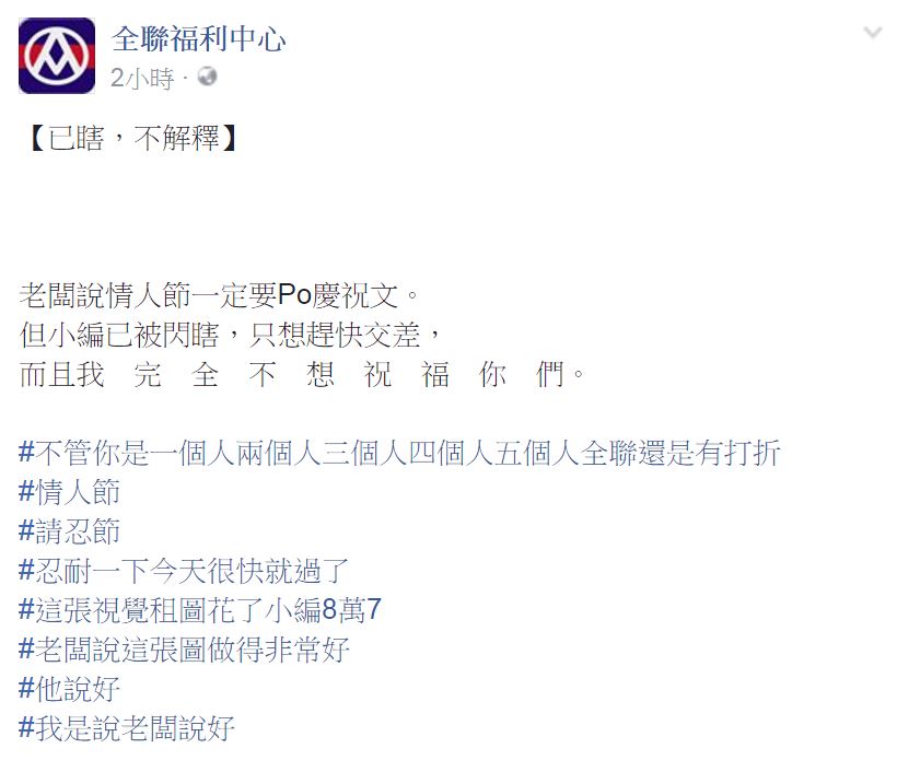 厭世的小編在臉書無奈地說,老闆交代情人節一定要PO上慶祝文,但是因為小編已經被情侶們閃瞎,只想要趕快交差,還淡然地說「而且我 完 全 不 想 祝 福 你 們。」所以對於尚未脫魯的人來說,情人節變成了「請忍節」,還開玩笑地說這張純白的視覺租圖「花了小編8萬7 」,更不忘宣傳「不管你是一個人兩個人三個人四個人五個人全聯還是有打折」。