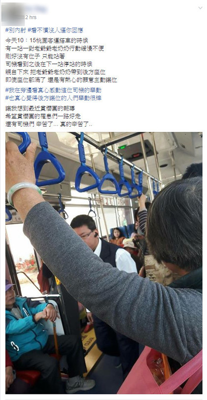 一名網友在臉書社團《爆料公社》發文,表示他今天上午10時15分搭乘桃園客運時,有一對行動不便的老爺爺、老奶奶上車。因為當時全車是滿座狀態,老夫婦只能緊抓扶手先站著。