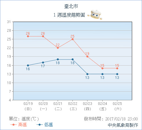 氣象達人彭啟明提醒,未來一週是天氣系統快速變動的一週,週一晚間開始,東北季風會稍微增強,中午高溫略降1~2℃,接著,很快地,週二下半天東北風又減弱,降雨減少,氣溫又會回升1~2℃。中央氣象局表示,週三(23日)高溫可能來到28℃,但下半天鋒面通過,各地會開始降雨,氣溫也會越晚越低,緊接著週四(23日)大陸冷氣團南下,低溫可來到13℃,而最高溫也只有19℃,到了週五週六的低溫可能只剩11℃,且值得注意的是,這波冷氣團偏濕冷,使得體感溫度可能更低。