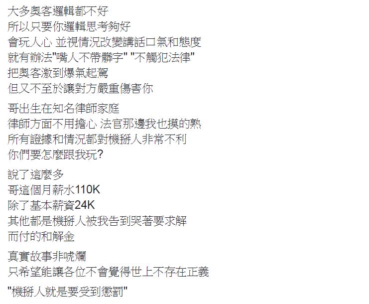 原PO自信的表示,因為自己「邏輯思考夠好、嘴砲功力夠強、也很懂法律」,所以遇到奧客從來沒在客氣,制服上的隱藏側錄器一開啟,就能安心開始正面對決!原PO指出,大部分的奧客邏輯都不好,所以只要拿捏分寸,並視情況改變講話的口氣和態度,就有辦法「嘴人不帶髒字」,也不會在過程中觸犯法律,更能把奧客激到爆氣,又不至於讓對方嚴重傷害你。