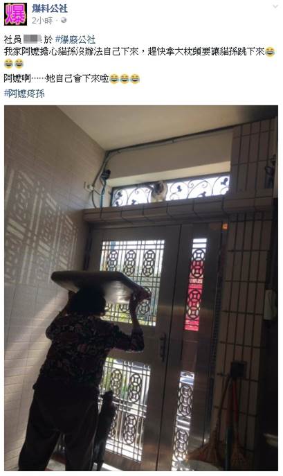 網友在「爆料公社」上PO文表示,「我家阿嬤擔心貓孫沒辦法自己下來,趕快拿大枕頭要讓貓孫跳下來」,隨文在附上圖,生動的場景,讓人看了會心一笑,不過網友似乎沒有要放過阿嬤,還補槍「阿嬤啊!她自己會下來啦」。