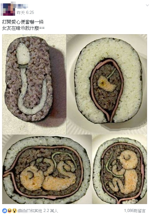 一名陸姓網友在臉書《爆廢公社》上傳一張照片,是女友為他做的愛心便當,只見壽司的花樣竟然被做成精子、受精卵、胎兒的圖案,隱藏在其中的「喜訊」顯而易見,所以在貼文中寫下「打開愛心便當嚇一跳,女友在暗示我什麼」。