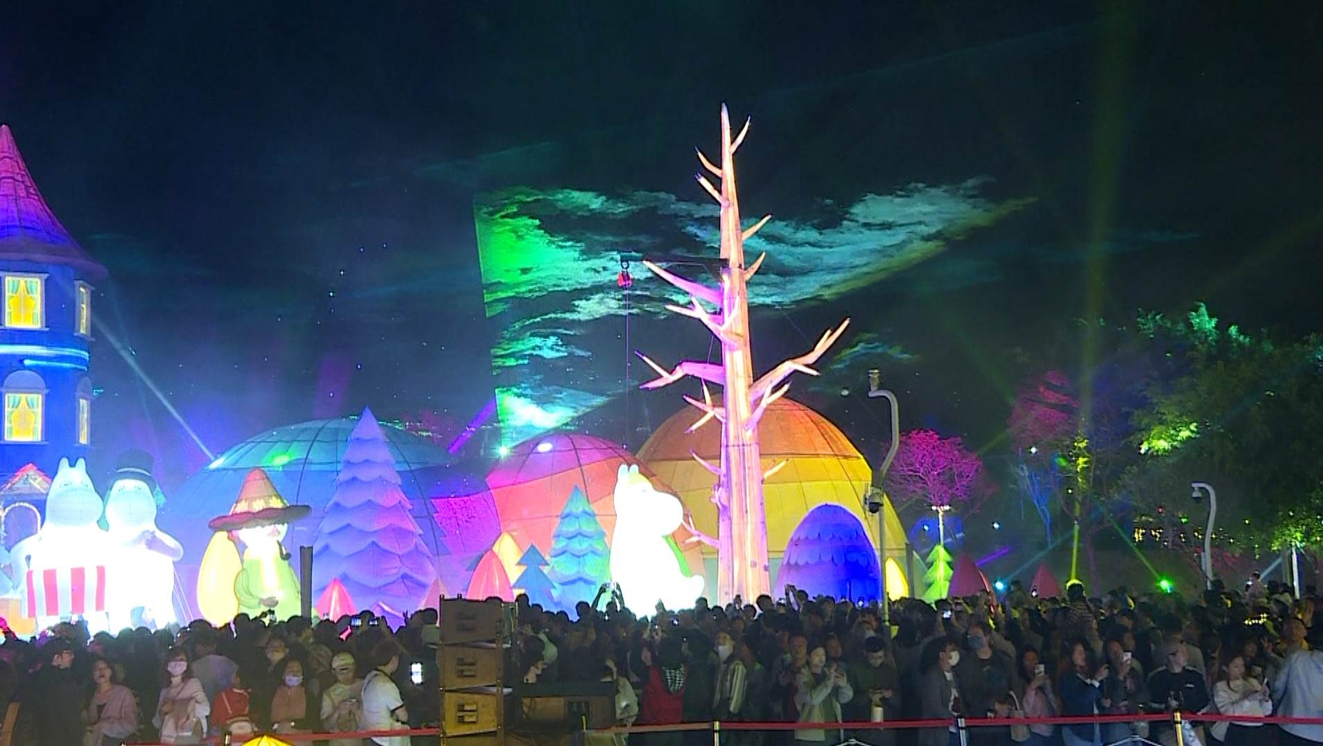 中台灣燈會15日晚間在臺中中央公園舉行點燈儀式,超人氣主題IP「姆明家族」齊聚一堂。主燈秀點亮臺中夜空,彷彿置身童話世界。臺中市長盧秀燕也親自發放姆明小提燈,現場氣氛歡樂熱鬧。