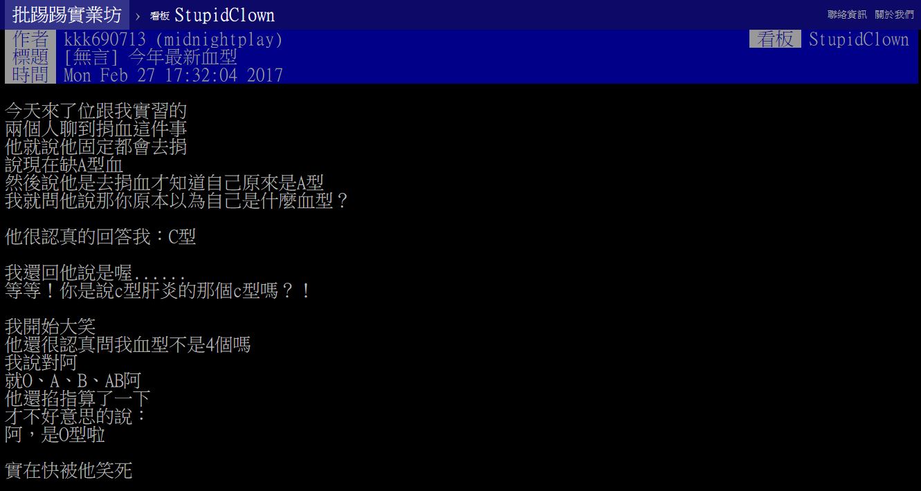 一名網友在《PTT》笨版發文,他說當天來了一位實習生,兩個人開始閒聊就聊到關於「捐血」這件事,實習生向他表示,當初是因為捐了血才知道自己原來是A型,而現在剛好正缺A型血,所以有固定在捐血。原PO聽了之後便問「那你原本以為自己是什麼血型?」,沒想到這名實習生很認真的回答是「C型」,不過原PO一開始只是隨意問問,並沒有發現什麼不對勁。