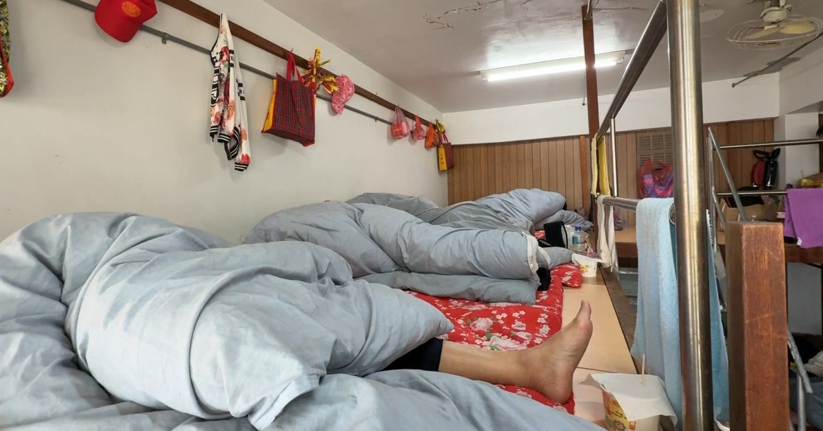 奉天宮香客大樓房間一打開,上下兩層超級大通鋪,一間至少可以住20人。不僅配備解暑神器變頻冷氣,25度開落冷風強力放送,還提供柔軟大棉被。婆婆媽媽坐著休息,臉上滿是輕鬆表情。