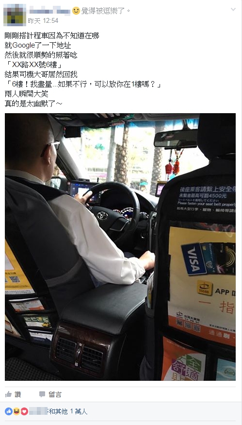 該名網友在臉書「爆廢公社」貼文表示,自己搭計程車的時候,因為不知道地址,於是Google了一下,接著順勢說出「XX路XX號6樓」,結果司機大哥先愣了一下,然後逗趣地說「6樓!我盡量…如果不行,可以放你在1樓嗎?」,這樣的回應,讓他們兩人同時大笑,原PO也忍不住直呼「太幽默」。
