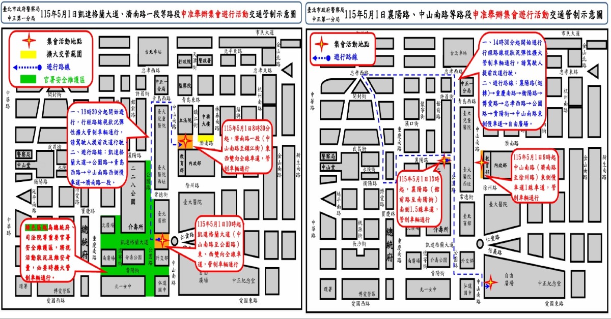 轄區中正一分局表示,針對遊行隊伍移動將採「彈性管制」,並視人數多寡擴大範圍。請駕駛人避開管制區域,建議多利用大眾運輸工具。如必須開車經過,請收聽警察廣播電臺掌握即時路況,並遵循現場員警、義交指揮減速慢行,避免交通延滯。