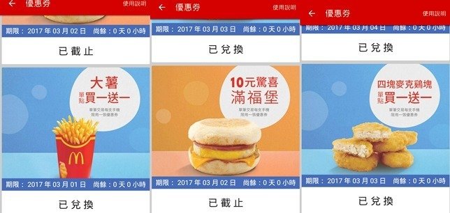 ▼每個帳號,每天都可以抽優惠券,優惠券包括買一送一、1元優惠或是10元等,每張優惠券的期限是3天,不少店家都可以讓消費者一次兌換1張以上的優惠券。(圖片來源/