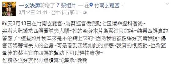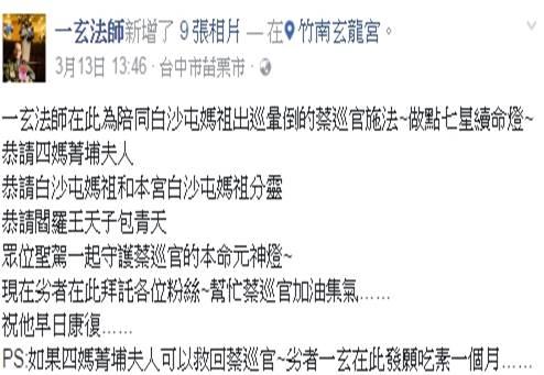 竹南玄龍宮的一玄法師在臉書PO文表示,幫「蔡巡官做完點七星續命燈科儀後」,又請求四媽
