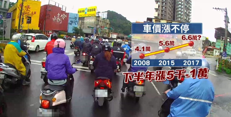 物價實在漲到受不了,2008年機車平均售價只有4.1萬,但2015年已經飆到5.6萬,而在2017年六期環保標準上路之後,下半年可能還會再漲至少5千。包含光陽、三陽、山葉等機車大廠都說,為了達到六期環保標準,業者也必須加裝噴射引擎,還有車上診斷系統等零件,整體成本至少上漲一成,下半年