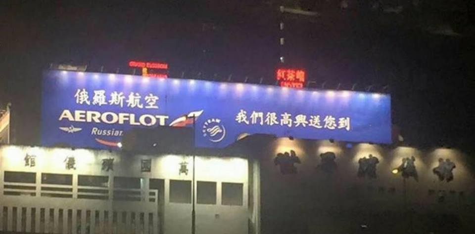 有網友在臉書《爆笑公社》分享照片,只見俄羅斯航空大大的廣告看板,整個板面採用藍底白字,看起來明亮又顯眼,上頭的廣告標語寫著「我們很高興送您到…」,而下一行的字因為拍攝角度的關係,就被前方建築物遮住了。