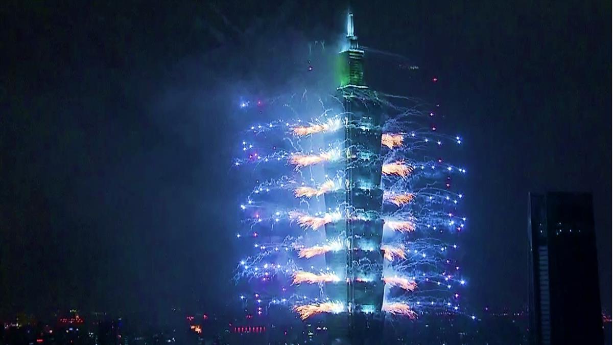 101煙火秀在萬人倒數計時後,隨著音樂大黃蜂的飛行一同綻放,照亮台北夜空。