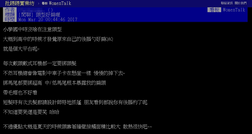 這位女網友在PTT上表示,到高中才發現自己的後腦勺很扁,「是個大平台」,甚至每次戴頭戴式耳機時都得綁頭髮,以免耳機如電影中「車子卡在懸崖一樣,慢慢的掉下去」。除此之外,綁馬尾時都要綁很高,因為中、低馬尾會暴露出自己的