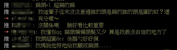 此文PO出後,網友紛紛表示感同身受:「我也是扁頭,很討厭綁頭髮」、「我也超級扁,我都早上洗頭不然睡起來都塌塌的」、「我也是扁頭,有次剪頭髮還被設計師狂笑,說沒看過這麼扁的後腦勺,還叫我朋友過來一起摸,超過分」。也有網友表示,「已慢慢釋懷,因為自己看不到」、「我這輩子從來沒注意過誰的頭是扁的誰的頭是圓的欸?還有分喔?」不過也有網友表示,「超扁+1,但我媽說這樣才好看」、「我也是扁頭,我媽說以前阿嬤特地把我顧成這樣的」、「我媽說她特地給我顧成扁頭」。