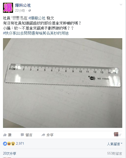 一位網友在「爆廢公社」貼出一張透明塑膠尺的照片,並問「有沒有廢友知道鋸齒狀的部份是拿來幹嘛的嗎?」,結果眾人紛紛跳出來分享自己的用法,比較正常一點的包含「畫重點!」、「那是書名號!」、「畫波浪線」,而比較逗趣的則是「切橡皮擦」、「鋸隔壁同學的手」、「Now癢癢」。
