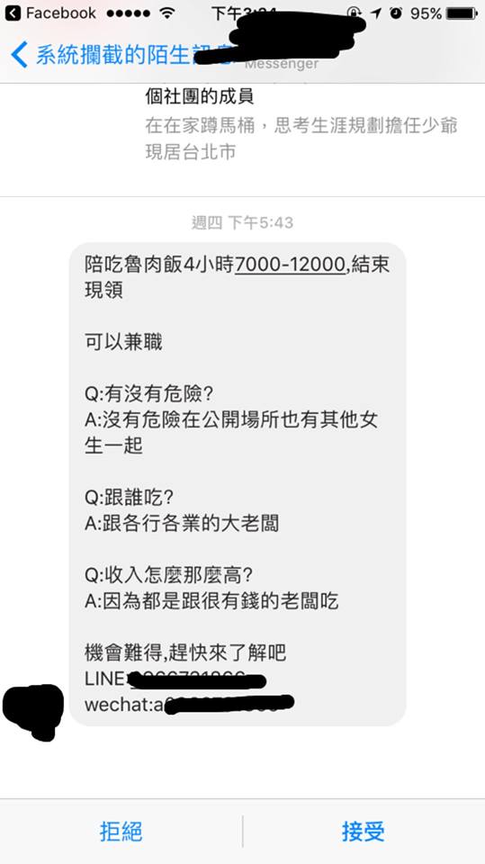 從女網友PO出的照片可以看到,女生只要陪吃魯肉飯,4小時就可以拿到7千元~1萬2千元的薪水,「結束現領,也可以當作兼職」,還在文末貼心附上「QA」問答,強調沒有危險,地點是公開場所,也有其他女生一起,並解釋為何友高報酬,是因為對向都是有錢的大老闆,最後附上Line和Wechat(微信)的連絡方式,「機會難得,趕快來了解吧」!