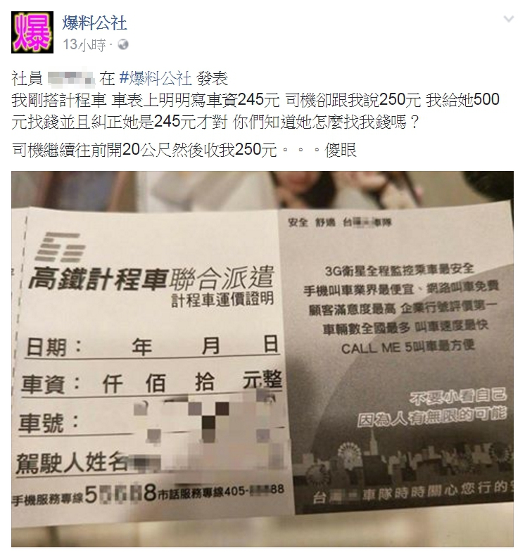 沒想到這位司機聽到之後沒有多做回應,就直接踩油門往前再開20公尺,直到車表跳到250元,接著就自動找了250元給他,讓原PO直喊「傻眼」,並且將這段超離譜的經驗分享到《爆料公社》。