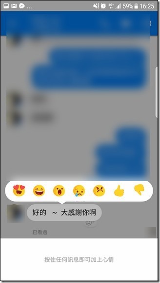 在這個表情列表中,有各種表情符號,比較值得一提的就是他竟然有象徵「爛」的倒拇指圖案,設讓你用來跟朋友吐槽的嗎?不管是哪個,你只要點選你朋友最新一則的訊息,就可以針對他的訊息內容送出更直接的表情符號。