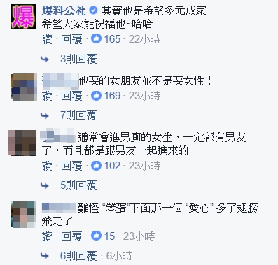 神回」、「支持多元成家」、「他要找的是男朋友啦」、「公厠裡總是會有些笑話~幫助排便啦」、「笑死」。