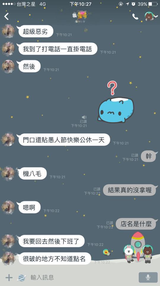 一名網友上傳了和朋友的對話截圖,他說朋友在某大公司擔任送貨員,昨天晚上天氣濕冷下著雨,朋友上班接到訂單還是把貨送到指定地點,不過到了之後對方卻緊閉大門,打電話過去也一直被拒接,還在門口貼上「愚人節快樂公休一天」的字條,讓他氣得傳訊息向原PO抱怨,怒批對方「超級惡劣」!