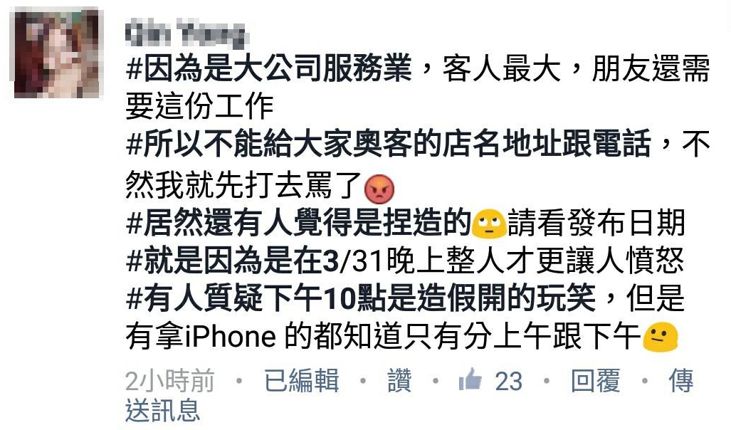 不過有不少人質疑原PO也是在開玩笑,對此,原PO留言表示,就是因為是在3月31日晚上整人才更讓人憤怒,「有人質疑下午10點是造假開的玩笑,但是有拿iPhone的都知道(時間)只有分上午跟下午」,解開網友們的疑慮。