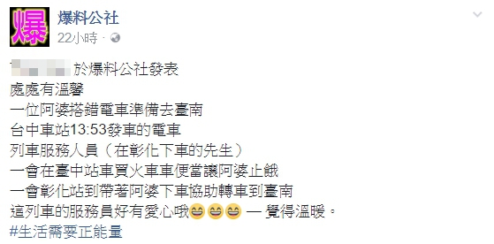網友PO文說表示,火車上有一位阿婆搭了錯電車準備去台南,她搭到了台中車站13:53發車的電車,而在彰化下車的列車服務人員見狀後,先在台中站買了便當給阿婆,讓她不至於餓肚子,之後列車停在彰化站時,又帶著阿婆下車,並協助她轉車到台南。網友表示:「這列車的服務員好有愛心哦!」