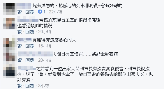 也有網友提出相關的經驗,表示過去搭車時曾經看到一位出家人詢問列車長有沒有素食便當,列車長說沒有,但沒想到過了一會兒就拿出了自己帶的素食餐點給予那位出家人,此舉也讓他覺得感動與印象深刻。也有網友提到,「台鐵的基層員工真的很讚很溫暖,也看過類似的情況。」