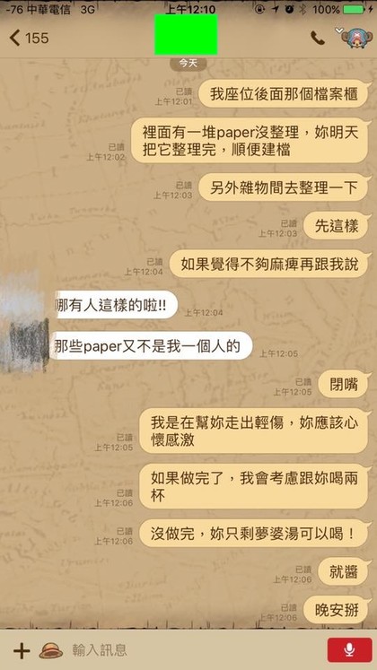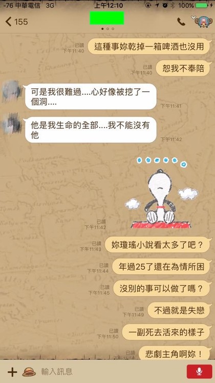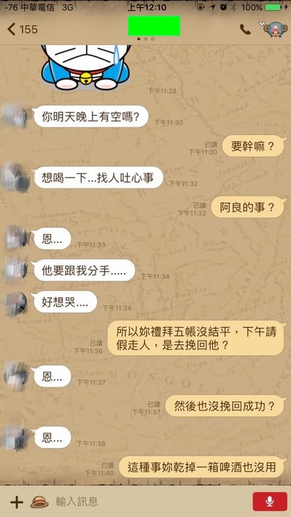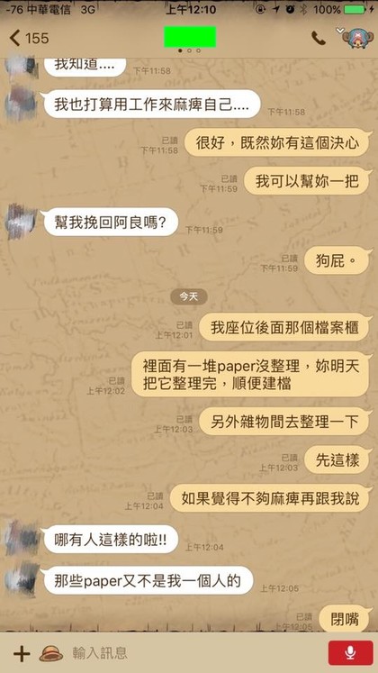 男網友在《爆廢公社》上PO出幾張他與女同事的對話紀錄,原來女同事丟下工作不管,跑去挽回變了心的男友,男網友不得不幫女同事接下沒處理的工作,沒想到同事工作沒完成就算了,連男友的心也沒有挽回,還想找他喝酒訴苦,火大的男網友訓他一頓後決心幫同事走出情傷,最好的方法就是工作麻痺自己,他指派了許多的工作給同事,讓她空洞的心瞬間被工作填得滿滿滿,完全沒有時間與心思再為失戀傷心。