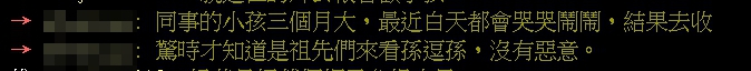 這篇文章PO出後有網友也表示自己邊有過類似的經驗,同樣都是親人因思念孫子而前來與孫子互動,網友指出,同事的小孩最近白天都會哭鬧,收驚後才知道是祖先來「逗孫」。也有網友開玩笑表示,「啊啊啊,阿公那裡不行」,有網友回應說,「看到標題就想歪了」、「預感推文會很歪」。