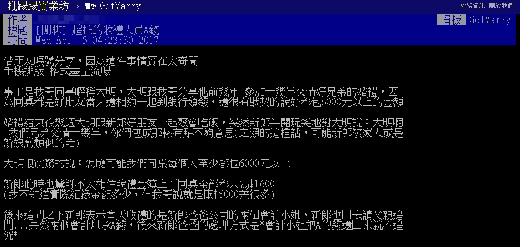 原PO在批踢踢《GetMerry》中發文表示,自己哥哥的同事「大明」,與一群好友在參加10幾年交情的兄弟婚禮時,約好一起到銀行領錢,每人都包6000元以上的禮金,展現兄弟情誼。沒想到在婚禮結束幾週後的一次聚會上,新郎突然半開玩笑跟大明說,兄弟交情都10幾年了,包的金額有點不夠意思。大明聽到這句話後感到震驚,隨即表示同桌的每個人都至少包了6000元以上。新郎也感到驚訝,因為他在禮金簿上看到同桌的人全部都只包了1600元。新郎感到困惑,之後請父親追問當時收禮金的「父親公司的兩位會計小姐」,沒想到不問還沒事,一問卻問出會計小姐「坦承A錢」,事情才終於真相大白。而事後新郎的父親決定不多追究此事,只要兩位會計小姐將錢歸還就好。