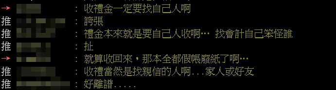 ▼網友紛紛回應原PO收禮應該要找自己人(圖/PTT)