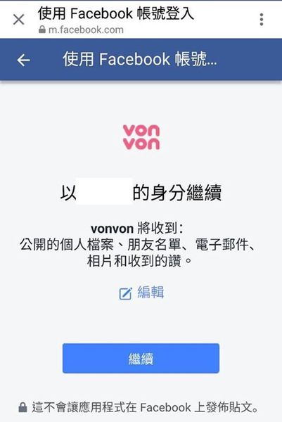 在 Facebook 的「設定」>「應用程式」>「vonvon」,將不想授權給 Vonvon 的個資的藍勾取消並按「儲存」。