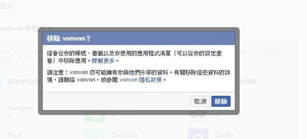 B.在自己臉書帳號移除vonvon避免個資被持續蒐集:
