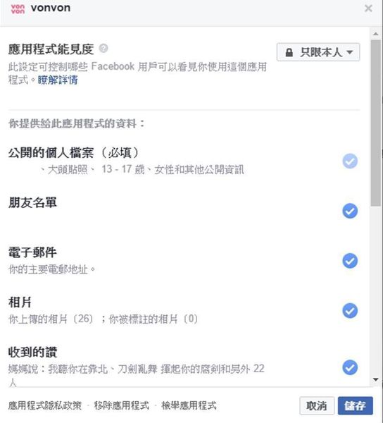 更讓人驚悚的是,即使你的臉書帳號事後移除了vonvon這個應用程式,但vonvon仍可能擁有你與他們分享的資料。