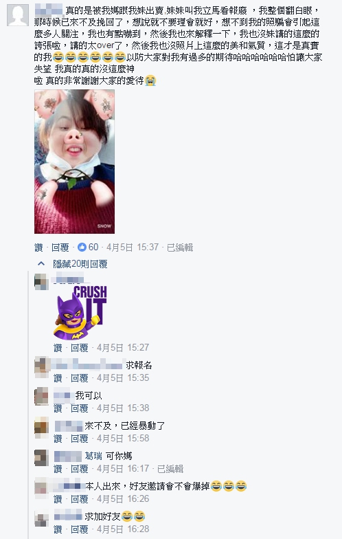 而這位氣質出眾的姊姊眼看事情越演越烈,親自跳出來喊話,表示自己真的是被妹妹和媽媽出賣,原以為不理會就沒事,但沒想到造成這麼多人關注,她強調妹妹講的太誇張了,「我也沒照片上這麼的美和氣質」,還隨文附上豬八戒造型的照片,試圖澆熄網友的狂熱心。