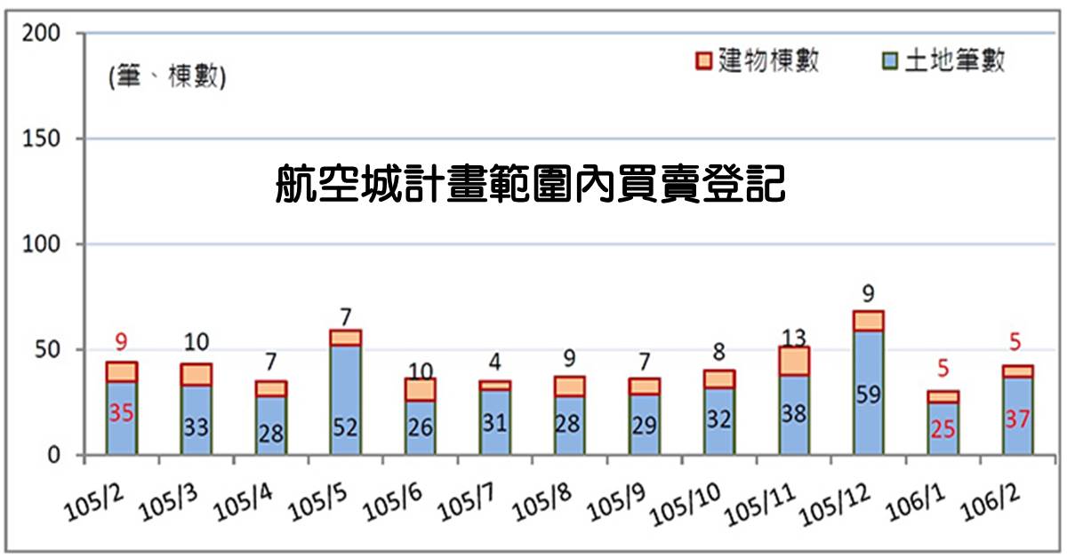 地政局說明,依據105年12月發布的實價登錄揭露案件資料分析,航空城範圍內揭露案件僅有農牧用地5件,均較前月(16件)與105年2月(13件)減少;乙種建築用地計2件,亦是年月雙減。