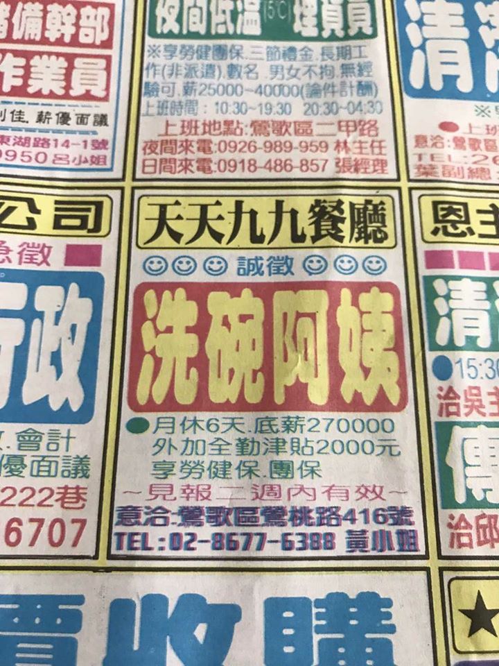 報紙上抖大的標題寫著「誠徵洗碗阿姨,月休6天,底薪27萬,享勞健保、團保」,甚至還在底下標註「見報二週內有效」,讓不少人眼睛為之一亮。
