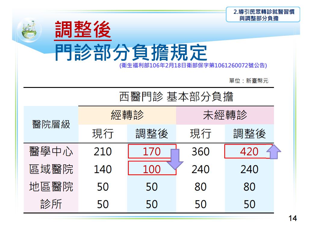 為了解決嚴重失衡的醫療生態,從明天開始到小診所看病時,若檢查出問題要再進一步檢查的話,一定要記得請醫師開「轉診單」,或是透過電子轉診平台媒合轉診,屆時到地區醫院就診後,部分負擔只要50元,區域醫院和醫學中心分別調降成100元和170元。可是,若沒有進行轉診的話,地區醫院就診部分負擔就要80元、區域醫院240元,醫學中心則
