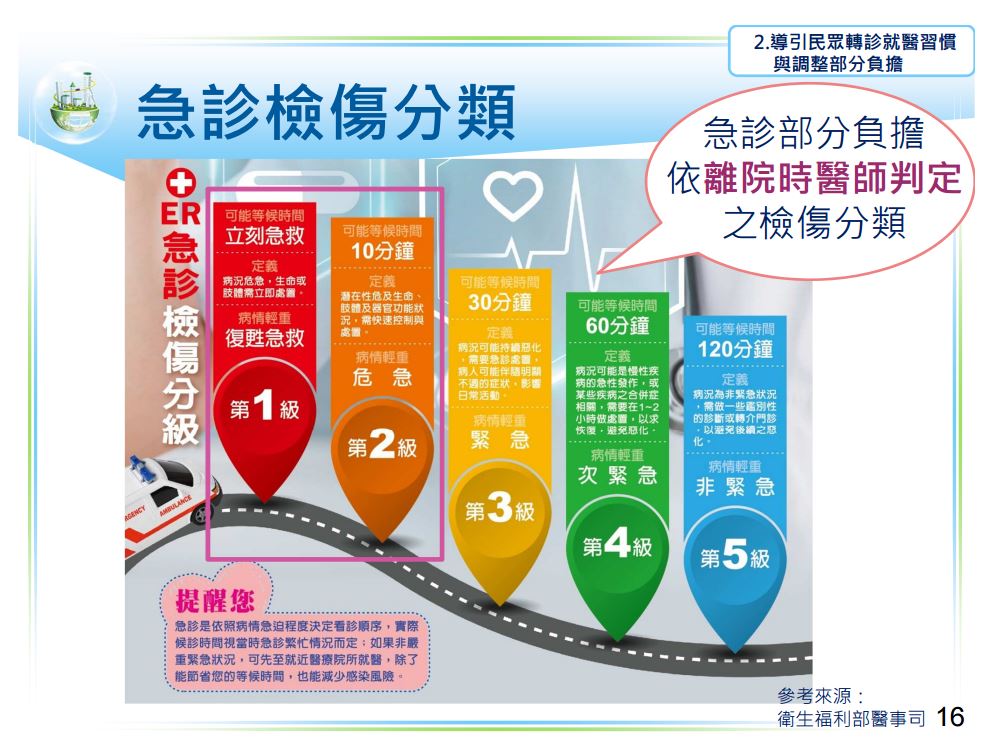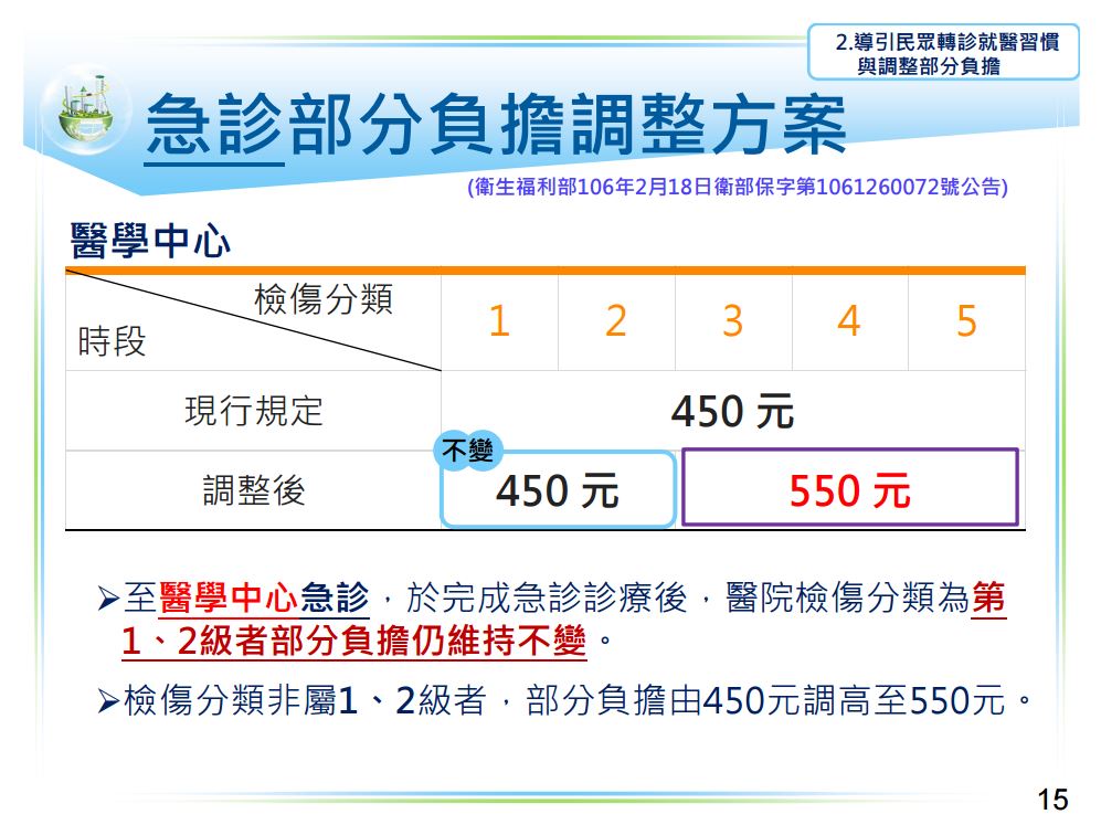 另外,民眾到醫學中心急診時,依檢傷分類認為是第三、四、五級者,部分負擔會從原本的450元調高至550元。