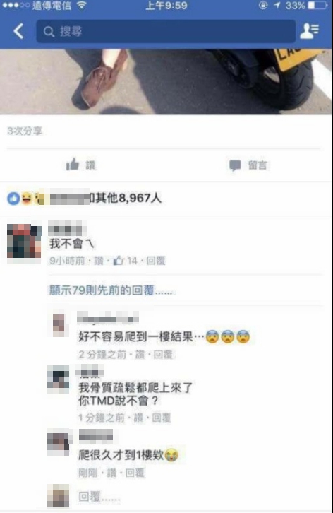 然而,當大家期待有神人P出完美照片,並且留言量累積到千則的的同時,有網友突然說「一樓神人」,網友們基於好奇心,無不拿著手機滑滑滑,滑到手指都要抽筋,好不容易找到傳說中的「一樓」時,每個都傻眼歪腰,因為所謂的神人,就是留個一個「我不會ㄟ」,氣得大家紛紛留言「好不容易爬到一樓,結果…」、「爬到一樓會怒」、「我骨質疏鬆都爬上來了,你TMD說不會?」、「3515是要叫人家怎樣爬,比101還高」。誰也沒想到,原本的P圖大會,一秒歪成「