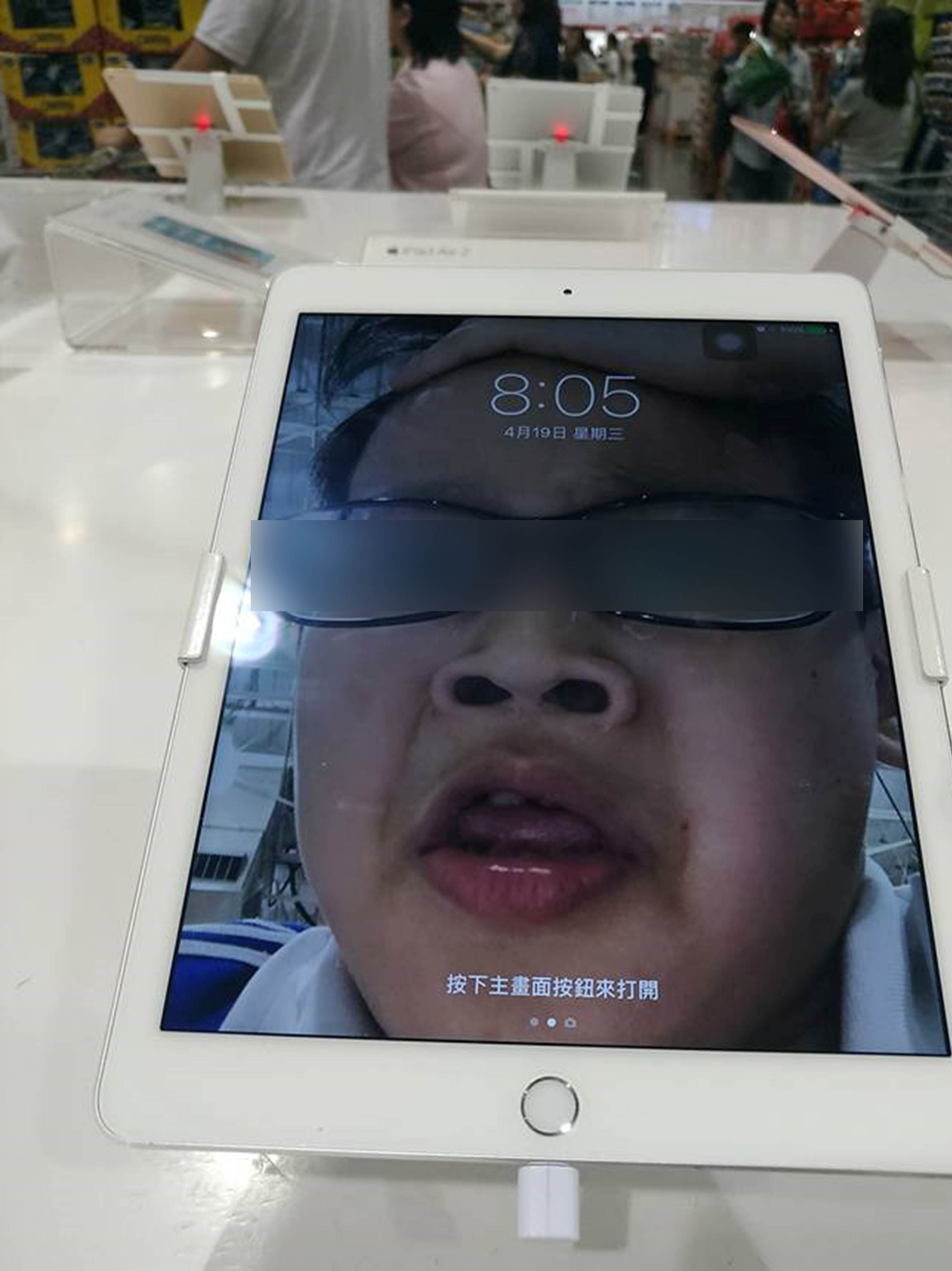 iPad上的桌布照,是一位佔滿全螢幕的自拍照,照片中的小弟將前額的頭髮撩起來,瞪大雙眼還不夠,還撐大自己的鼻孔,加上微張的雙唇,讓po照上網的網友直呼:「逛好市多,還是別自拍....被當桌布,弟弟你紅了」。