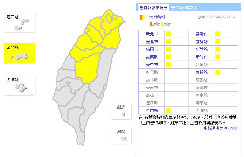 至於大雨特報的警戒範圍,包括新北市、基隆市、台北市、宜蘭縣、桃園市、新竹縣、苗栗縣、新竹市、台中市、南投縣、金門縣。
