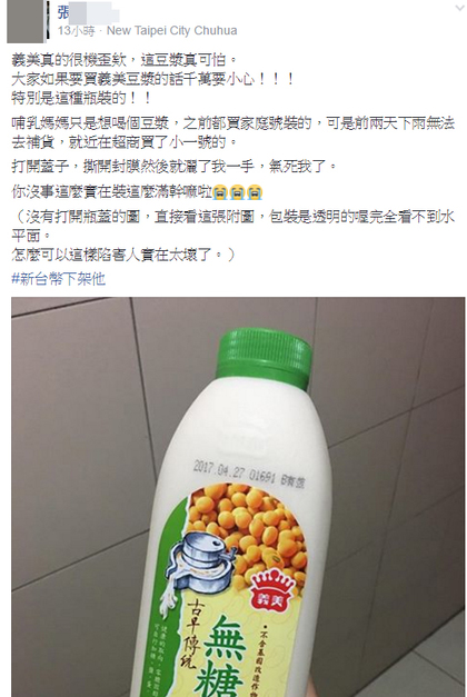 前陣子食安問題沸沸揚揚,號稱台灣食安良心的「義美」推出一系列產品,讓許多網友反串表示:「用新台幣讓義美產品下架!」擠下盤據豆漿龍頭多年的「統一」。不過現在有網友在「爆怨公社」PO文:「義美真的很機歪欸,這豆漿真可怕,大家如果要買義美豆漿的話千萬要小心!特別是這種瓶裝的!」