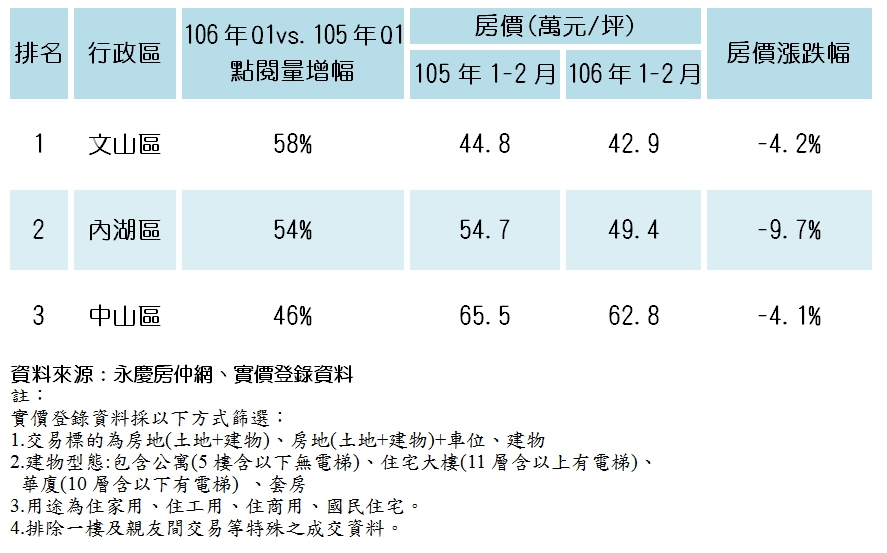 根據永慶房仲網統計,以106年Q1與105年Q1點閱量相比,台北市熱門點閱年增率前三名分別是文山區,增幅58%,其次則是內湖區,成長54%,中山區則以46%位居第三,謝志傑說明,文山區向來有「文教區」之稱,區內住民多為軍公教人員,區內住民素質高、房價實惠,105年1-2月房價每坪44.8萬,106年1-2月房價向下修正至42.9萬,跌幅約4.2%,房價相對穩定,吸引購屋民眾目光,點閱量大增;內湖區則在文湖線開通後,交通便利、生活機能完善,加有內科產業聚落成形,居住需求增加,房市交易量穩定,今年1-2月與去年同期房價相比,跌幅9.7%,在房價有感修正下,成為熱門點閱區域;至於中山區,位處市中心精華區塊,在市場降價共識成形,加上產品多元,成為民眾想搶進台北市中心區塊的熱門行政區。
