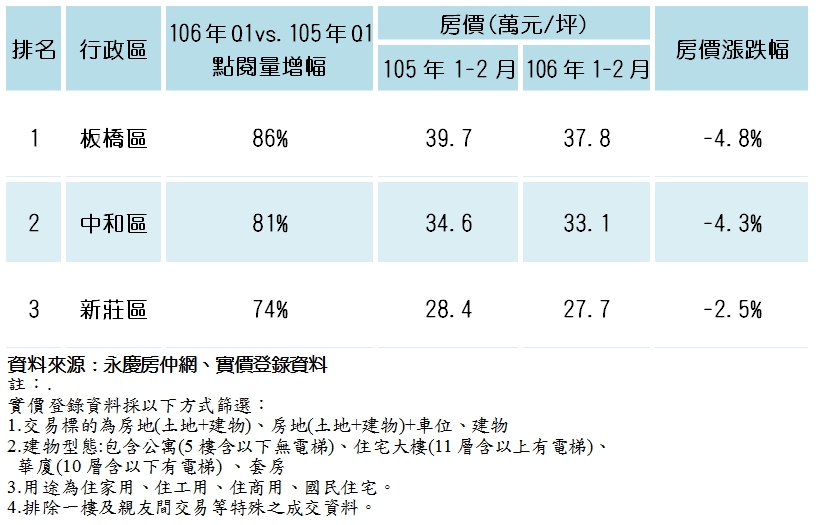 至於新北市熱門點閱行政區,以板橋區增幅高達86%居冠,其次則是中和區較105年Q1成長81%,第三名則是新莊區增幅74%。謝志傑指出,板橋區是新北市市政中心所在,區內商圈、交通發展均已臻成熟,原本就是民眾最想進駐的區域,過去因房價高漲,讓人望之卻步,但在房市反轉修正已二、三年,加上重劃區新案破盤價搶市,引發區域房價下修,今年1-2月房價每坪37.8萬,較去年同期下跌4.8%,房價已親民許多,民眾趁房價相對低檔,積極尋屋比較。至於中和區,一直是首購族群青睞的熱門區域,未來環狀線將使交通路網更趨完善,吸引民眾關注。謝志傑說明,熱門點閱第三名的新莊區,在機場捷運通車後,北市、桃園等地快速緊密連結,機能逐漸完整,房市買氣增溫,近期也成為熱門購屋點閱區域之一,今年1-2月房價每坪27.7萬,與去年同期相比,跌幅2.5%。