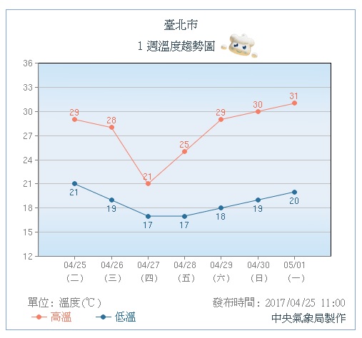 氣象局指出,今(25日)台灣附近風場轉偏南風,帶來暖空氣,西半部高溫可達30度上下,東半部高溫也有28、29度。但明天傍晚鋒面抵達,伴隨對流性降雨,各地有較大雨勢,建議民眾出門記得備傘;鋒面後冷空氣隨之南下,週三晚至週四氣溫一路下降,週四晚北台灣低溫降至16、17度。